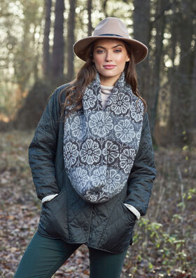 Die Accessoires in dieser Kollektion von Martin Storey sind von traditioneller nordischer und folkloristischer Malerei inspiriert und sind mehrfarbige Strickstücke, bei denen hauptsächlich in der Runde gearbeitet wird. Zu dieser Kollektion gehört auch der berühmte Moonflower-Mantel.