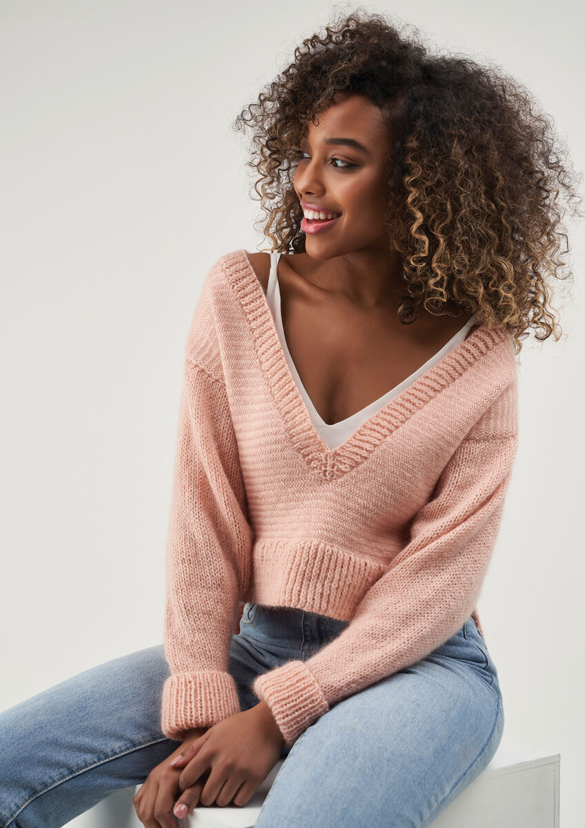 This cropped v-neck sweater designed by Tiam Safari in Kid Classic, it is the perfect light layering piece. Herringbone stitch on the front adds eye-catching texture and contrasts with the stocking stitch of the back and sleeves. Ribbed edges finish it off.
