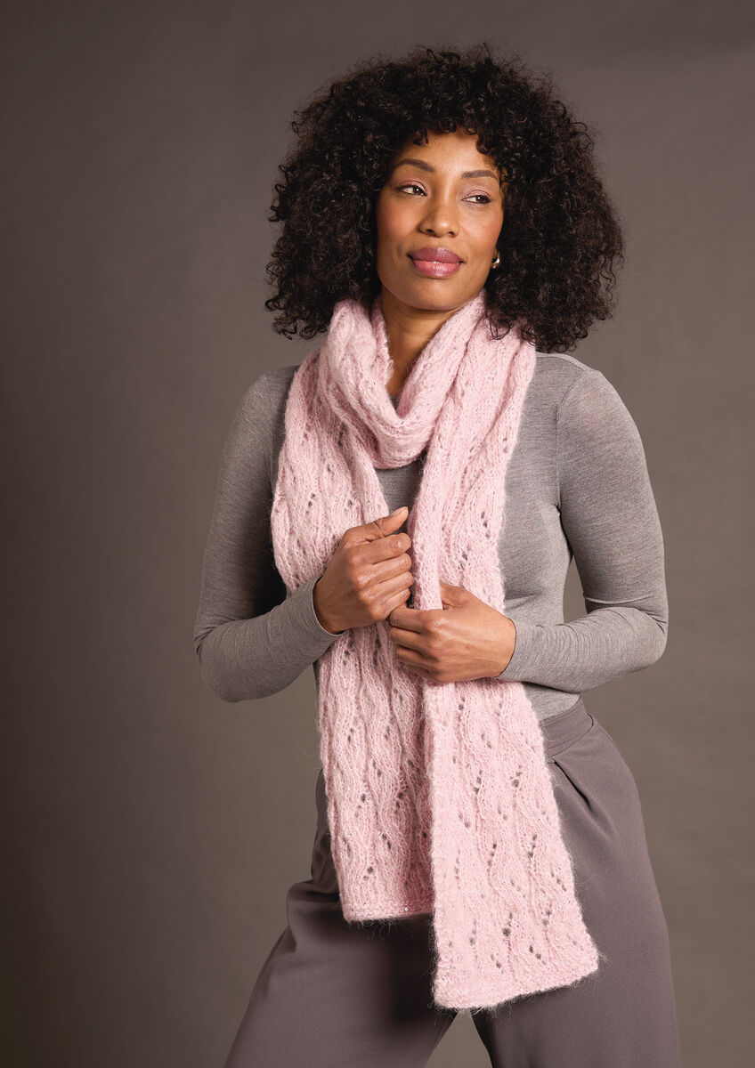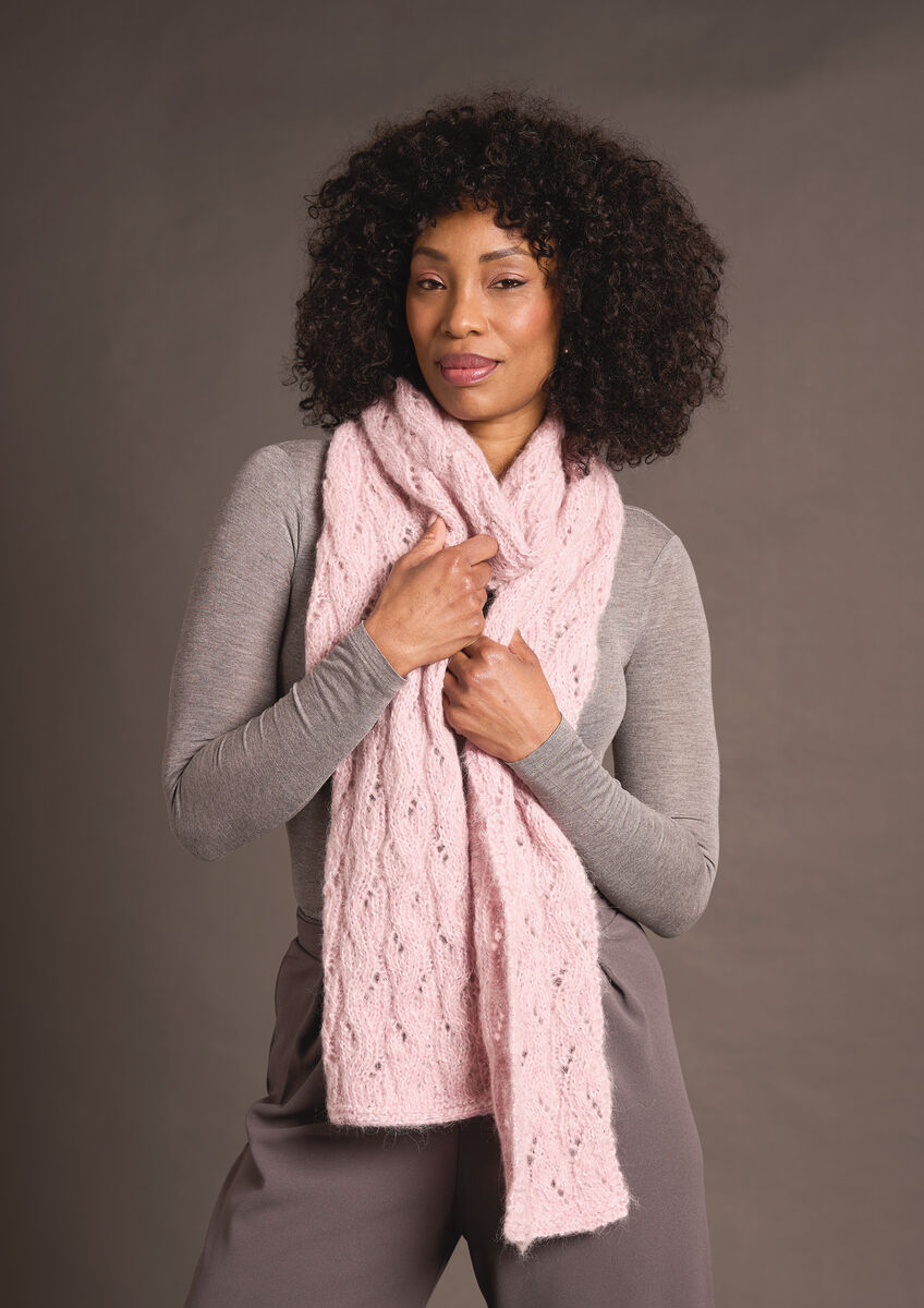 Zopf- und Lochmuster sind eine tolle Kombination und hier harmonieren sie perfekt mit dem dezenten Schimmer des Alpaca Sparkle-Garns. Dieser kuschelige Winterschal von Lisa Richardson ist ein Must-have für deine Garderobe und verleiht dir einen Hauch von Luxus.
