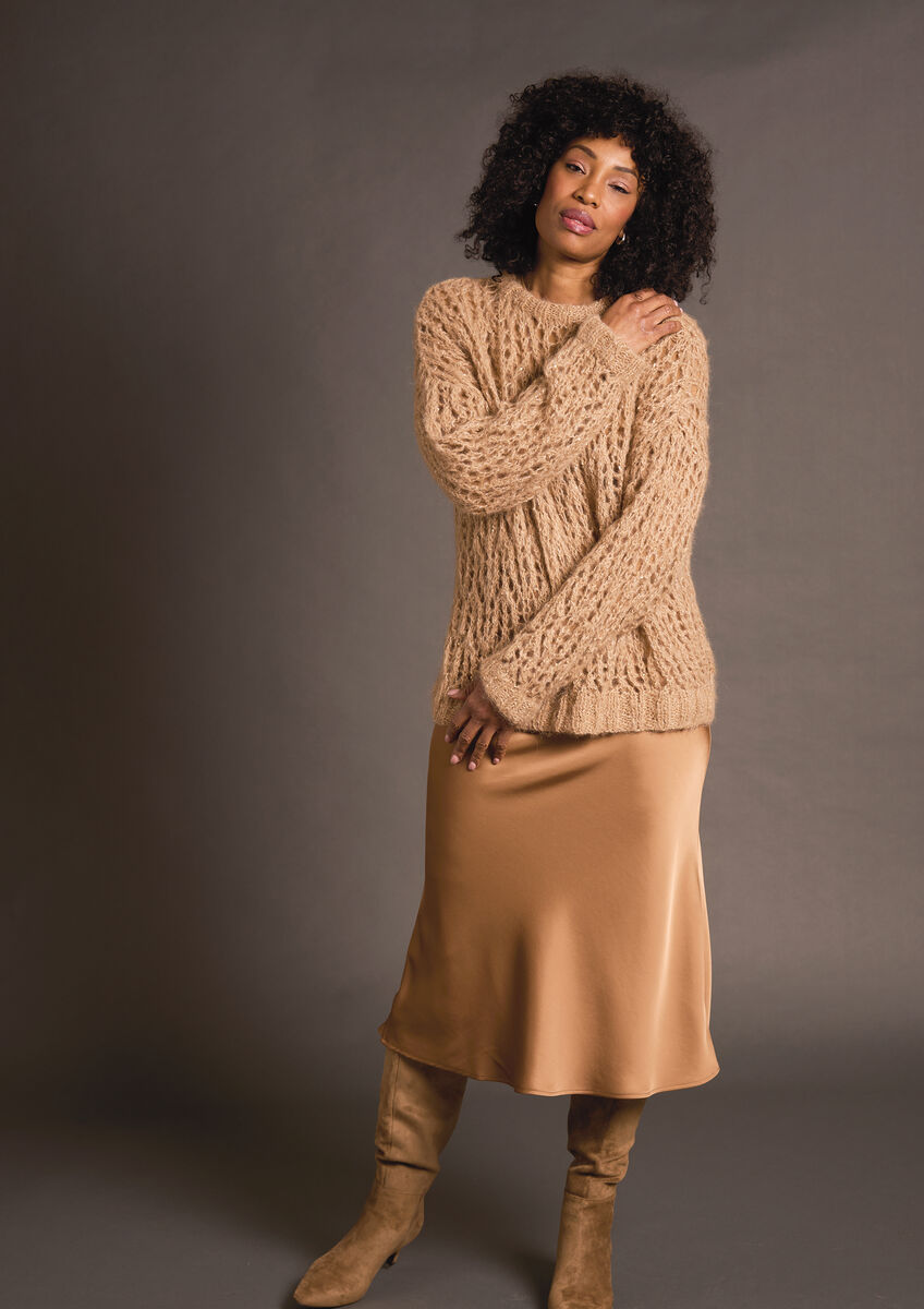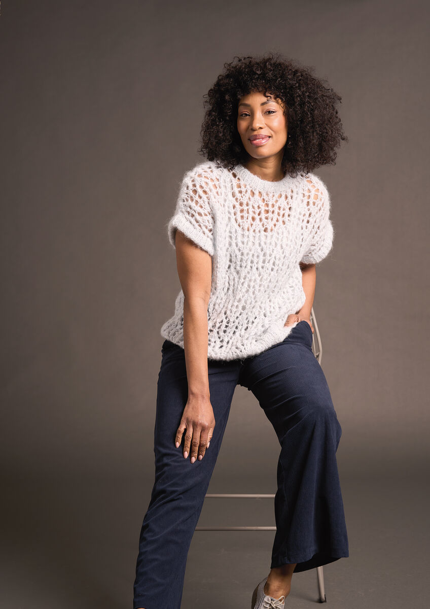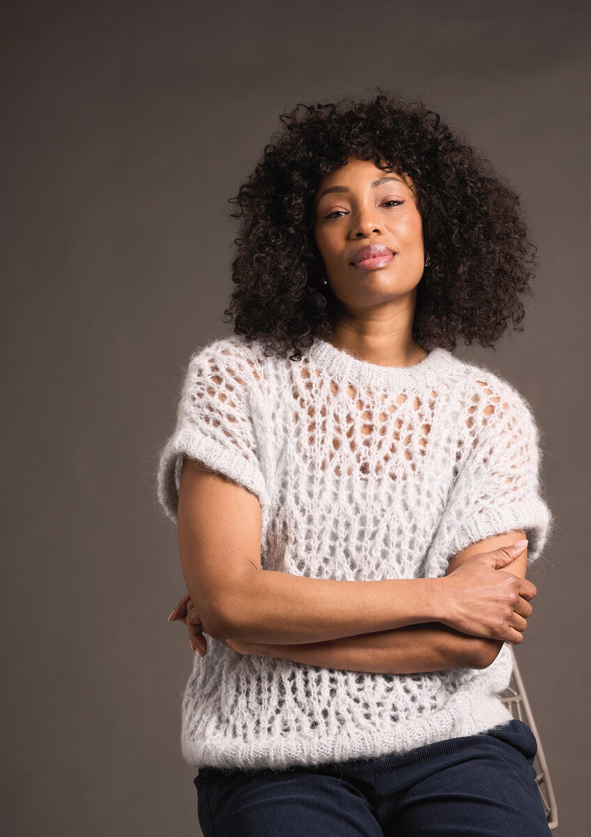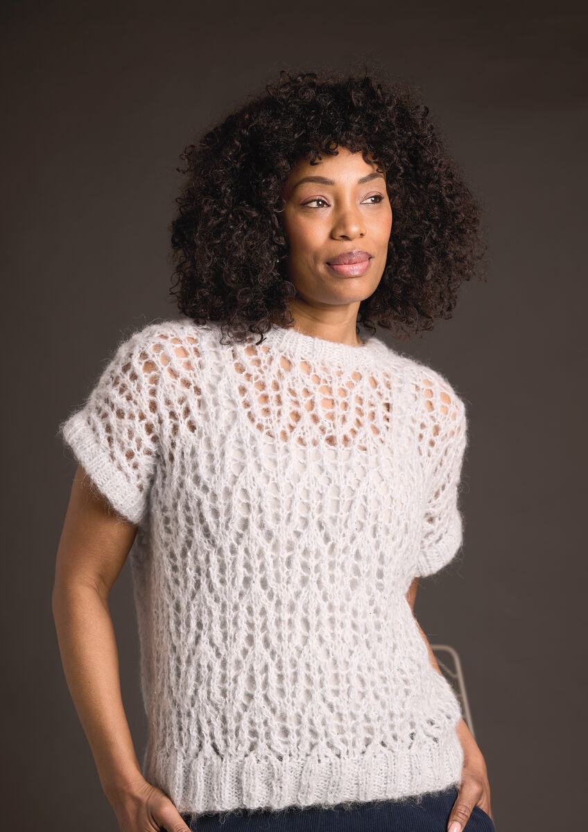 Dieser Pullover mit Lochmuster von Lisa Richardson ist eine großartige Wahl für den Herbst. Er ist aus Alpaca Sparkle gestrickt und besticht durch sein hübsches Lochmuster und die winzigen Pailletten. Stricken Sie ihn mit langen Ärmeln für zusätzliche Wärme oder kreieren Sie mit der ärmellosen Version einen stilvollen Lagenlook.