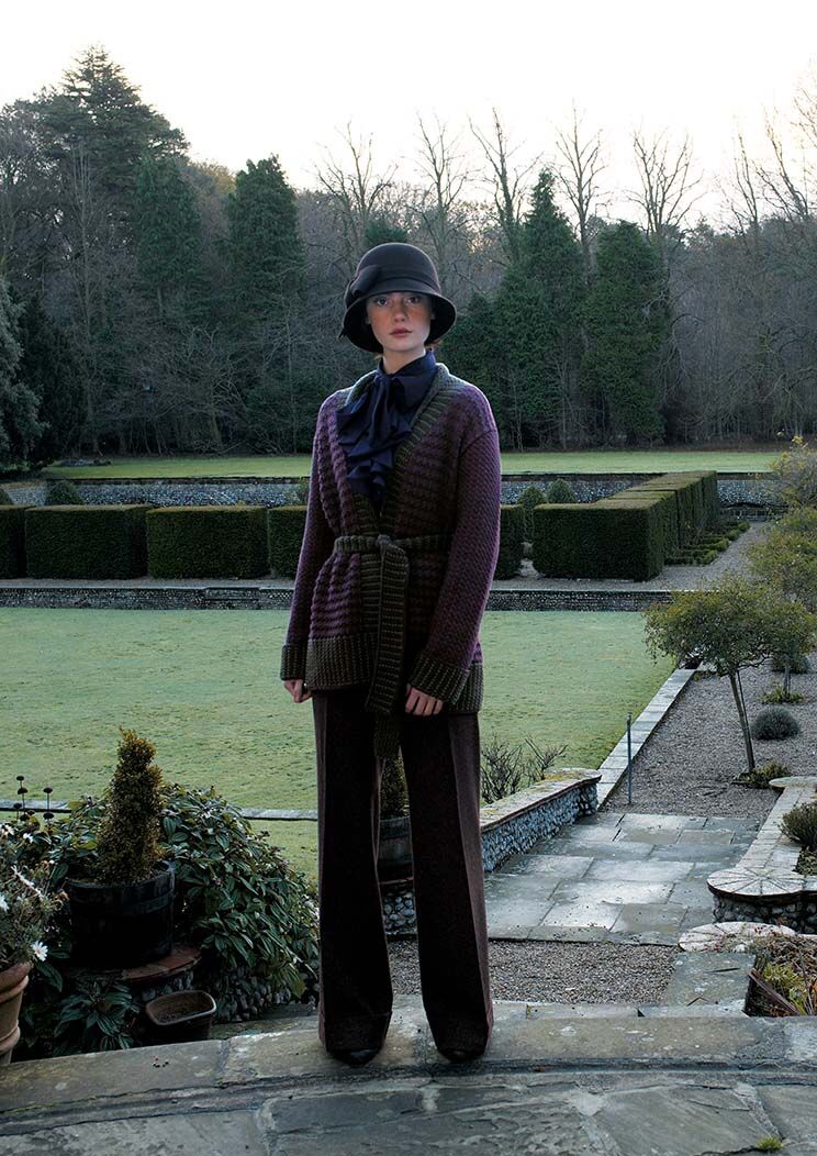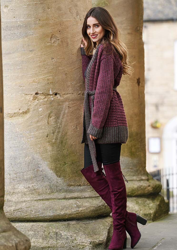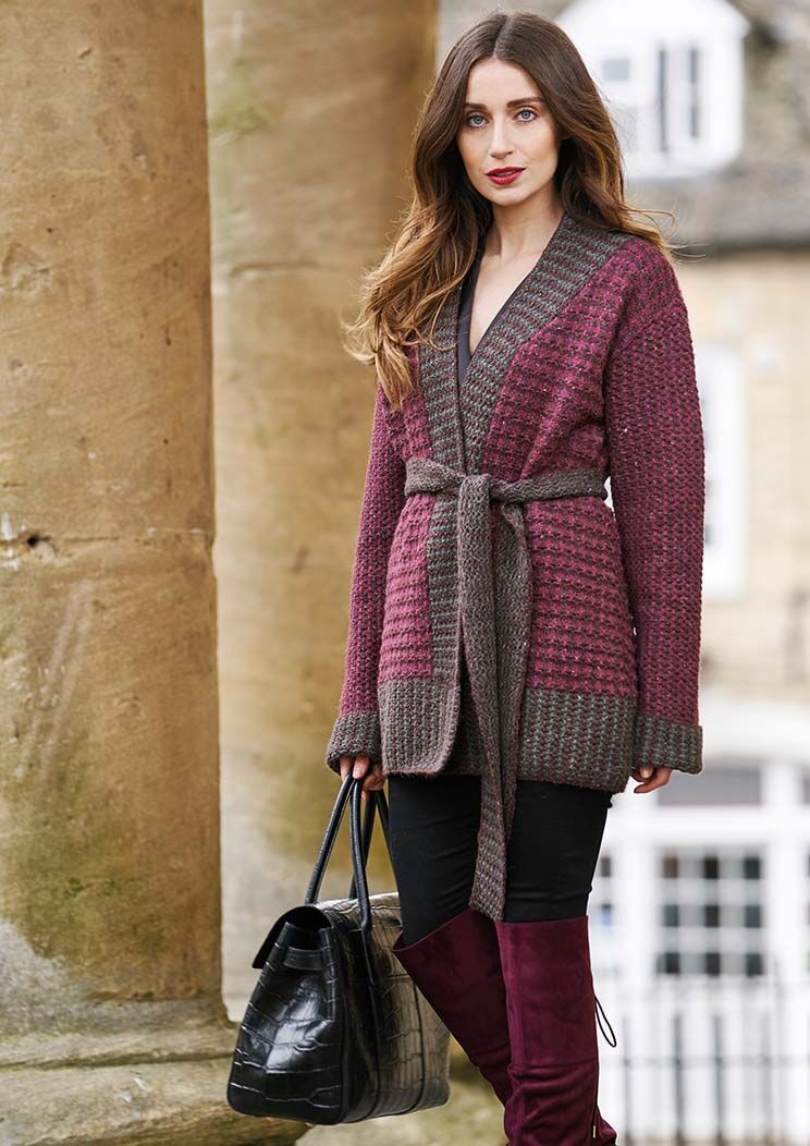 Knit this ladies longline cardigan, a design by Marie Wallin that has been re-styled and re-photographed for Rowan 40 Iconic Hand-Knit Designs. With a shawl collar, slip stitch pattern and contrasting edgings, this pattern Is suitable for the more experienced knitter.