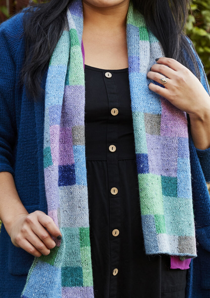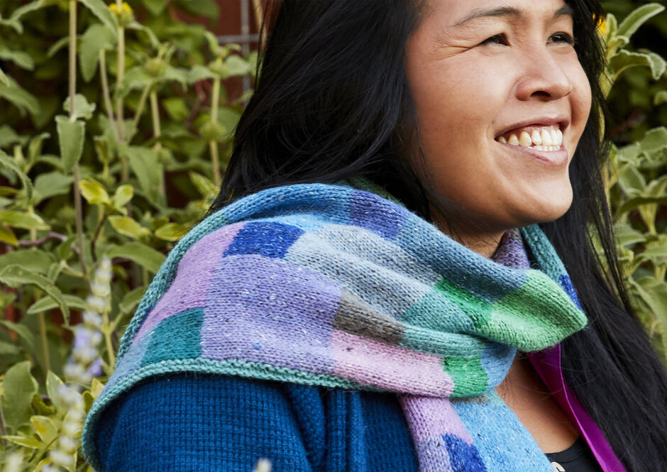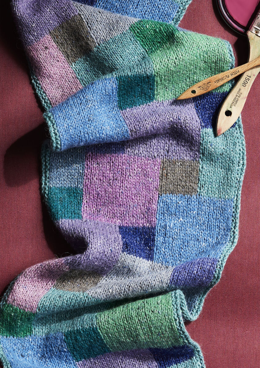 A simple rectangle of vibrant color becomes a cowl with one short seam. Kaffe shows it in two colorways—change the two background colors, and the effect is totally different.