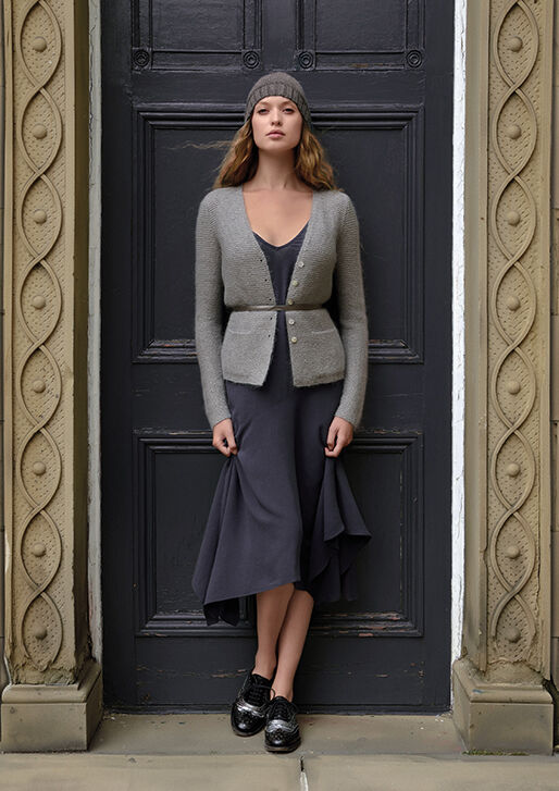 Knit this semi-fitted garter stitch cardigan in Rowan Kidsilk Haze and fine Lace. The simple cardigan has a scoop neckline and is suitable for a knitter with a little experience.