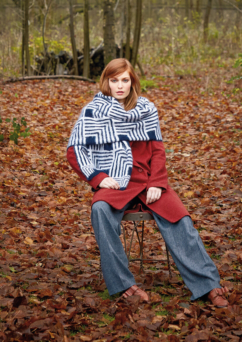 This eye-catching shawl was designed by Kaffe Fassett. Knitted using intarsia it is a unique accessory for your winter wardrobe. It is knitted in two shades of Kidsilk Haze, a luxurious blend of 70% mohair and 30% silk.