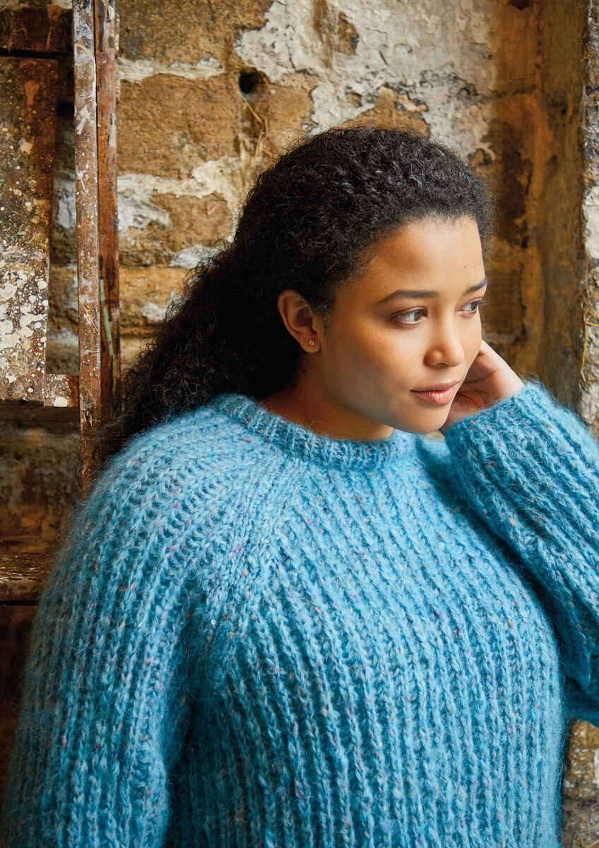 This cosy raglan sweater is knitted in the beautiful new Tweed Haze using a slip stitch rib throughout. Designed by Lisa Richardson, the sweater has a classic crew neck, long sleeves and a slightly longer length hem for a flattering fit.
