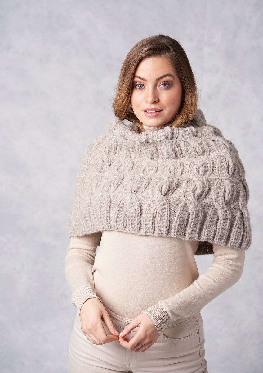 Designed by Martin Storey, this deep snood has an oversized cable pattern and is knitted in the beautifully soft but lightweight Brushed Fleece.