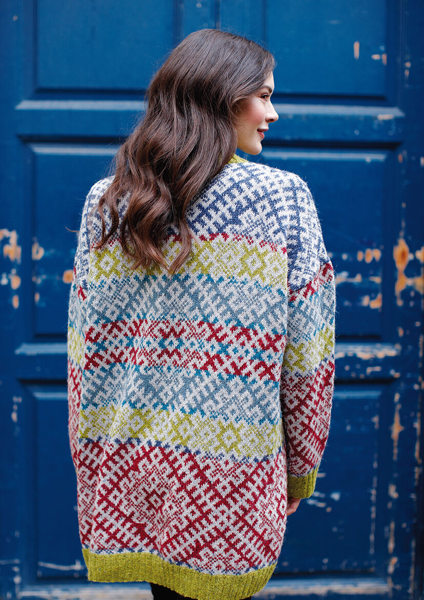 This long cardigan was designed by Martin Storey. It features a colourful fairisle pattern, drop shoulders and a contrast colour button band and ribs. It is knitted in six shades of Felted Tweed, one of our most popular yarns which is a blend of 50% wool, 25% alpaca and 25% viscose.