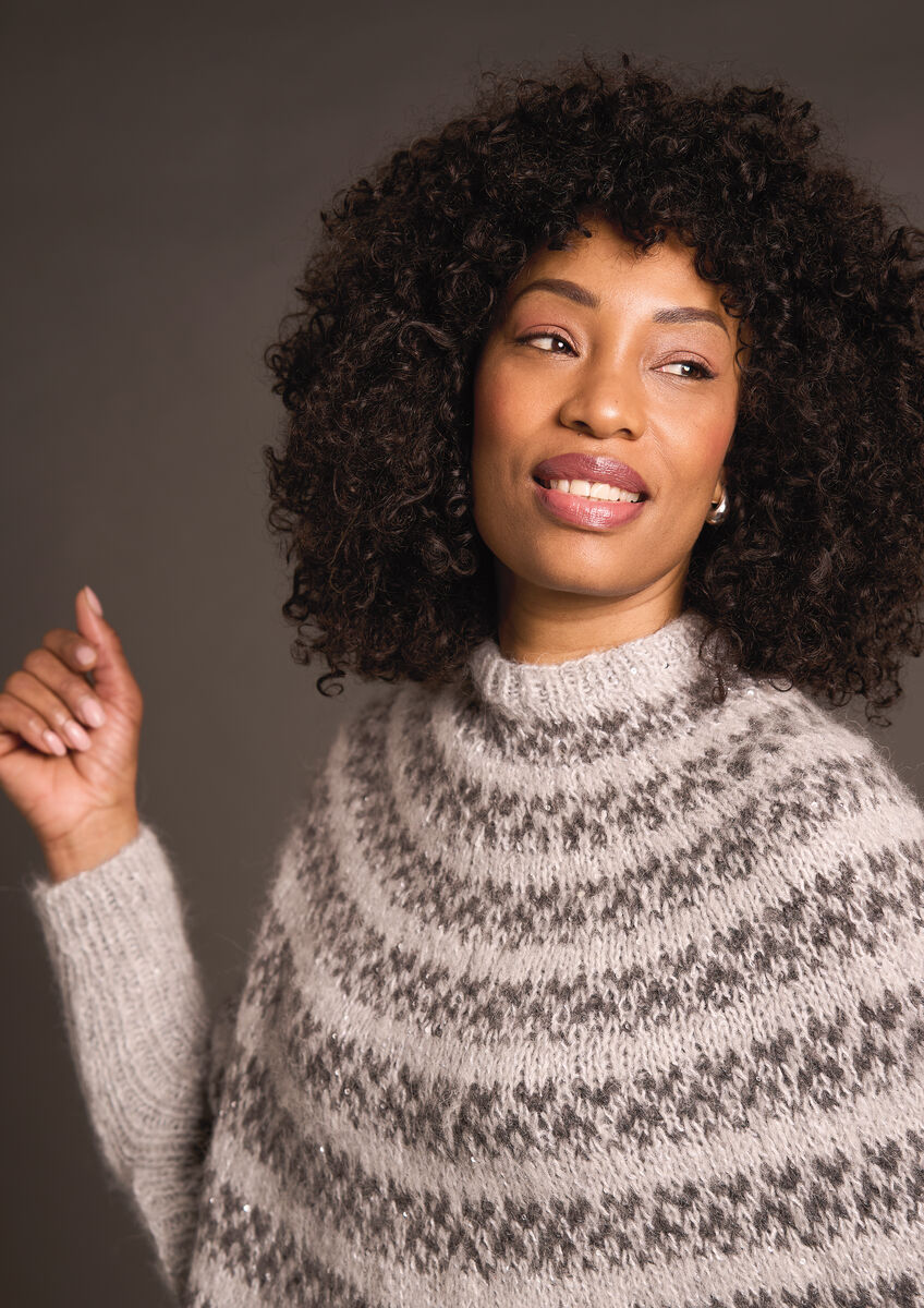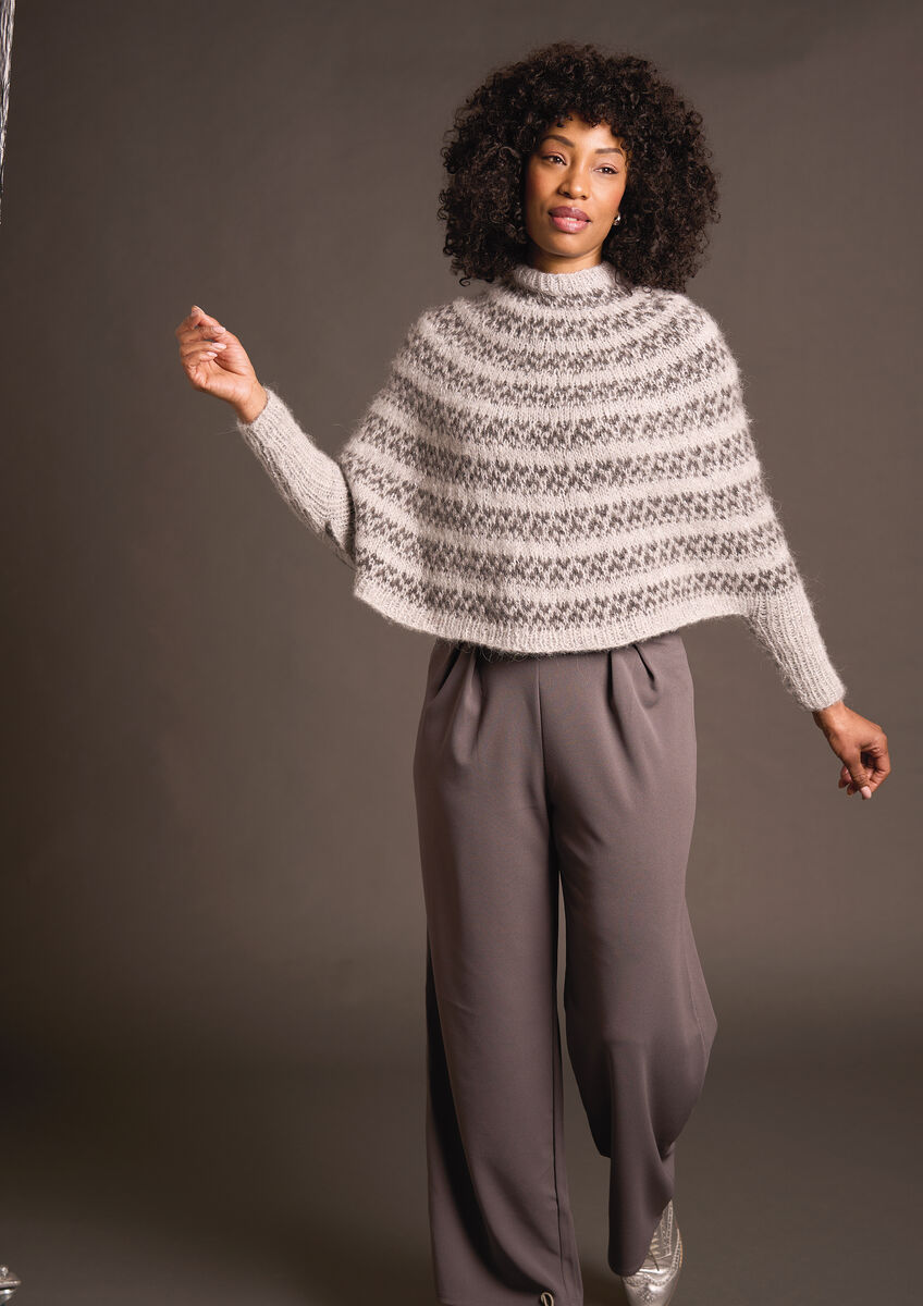 Un poncho est parfait sur toute tenue et ce modèle de Lisa Richardson ajoutera également une touche de glamour à votre tenue. L'ajout des bouts de manches en côtes en fait un choix à la fois élégant et pratique. Tricoté avec deux coloris du fil Alpaga Sparkle, ce joli poncho en mailles glissées se tricote en tours, du haut vers le bas.
