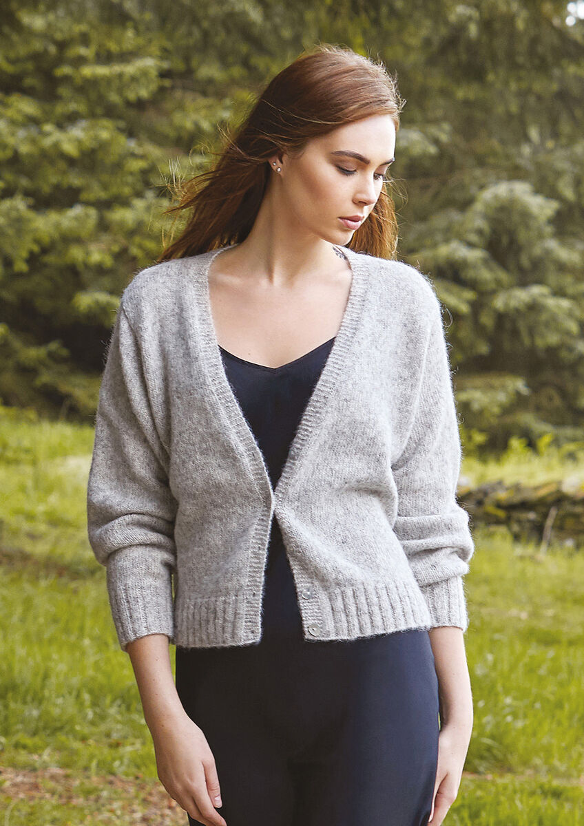 Knit this ladies v neck cardigan from Covet, a design by Kim Hargrevaes using our wonderfully soft, light yarn Alpaca Classic (alpaca and cotton). This classic cardigan is knitted in stocking stitch with ribbed edgings.